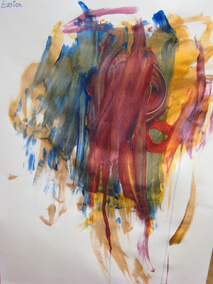 我常問Easton他在畫什麼?他會告訴我這幅畫的故事,還會用疑惑的眼神看著我,彷彿覺得奇怪:為什麼爸爸看不到畫裡的故事?。這是Easton曾經說的圖的故事(斜體字是我問的):你在畫什麼?Flying Dragon啊!在那裡??在最上面這裡啊!我怎麼看不到?因為被black cloud擋住了啊!black cloud?那我猜這些流下來的就是從black cloud下的雨囉?!嗯!還有那個球啊!什麼球?就馬戲團的elephant在玩的那顆球啊!馬戲團的elephant?爸爸又沒看到了,在那裡啊?(Easton有點不耐煩)就在Flying Dragon的旁邊啊!他在那裡做什麼?跟Flying Dragon玩啊!