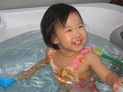 Auntie Min的院子有一個大按摩池,Lindsey和Easton最愛玩水了!