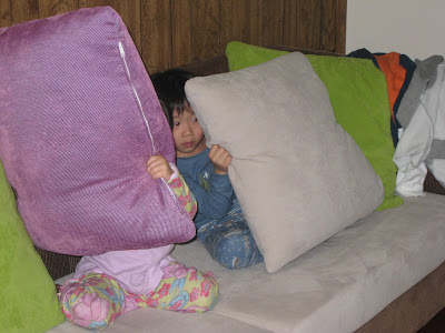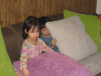 這天,Easton和Lindsey吃完晚飯後在客廳看卡通,過了一會兒,爸爸媽媽發現這兩個小朋友怎麼都沒有聲音?探頭看看客廳,看到兩個躲在抱診後面,一邊還不時在偷看。