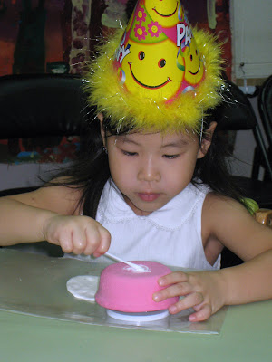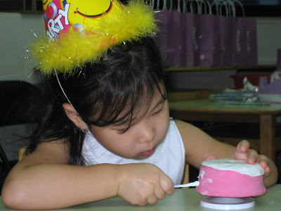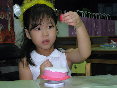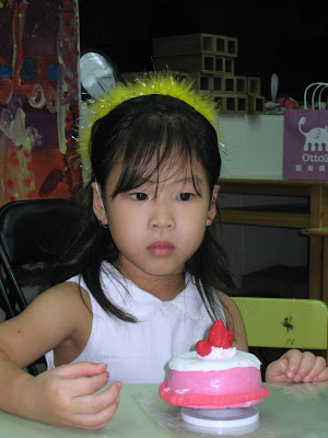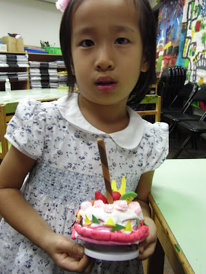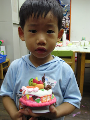 其實這次媽咪請Otto2的老師準備了黏土,讓每個小朋友可以做自己獨一無二的蛋糕喔!Lindsey選的是粉紅色的蛋糕,仔細的將“奶油”揉好,然後黏上去。